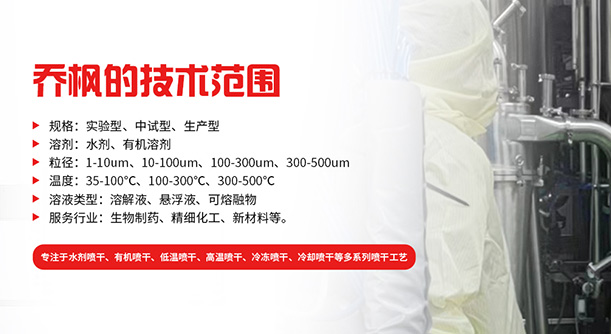上海喬楓實業有限公司,成立于2012年,是從事噴霧干燥設備的研發設計、生產、銷售(小型噴霧干燥機實驗型噴霧干燥機,35℃低溫噴霧干燥機有機溶劑噴霧干燥機低溫閉式循環噴霧干燥機超細粉末噴霧干燥機、噴霧冷凍干燥機、真空噴霧干燥機、氣流噴霧干燥機噴霧造粒干燥機離心噴霧干燥機,沸騰制粒機等)和售后于一體的綜合性公司,本公司現成為一家致力于為生物制藥、精細化工、新能源、陶瓷造粒及食品工程等領域提供全套解決方案的整線交鑰匙工程企業。